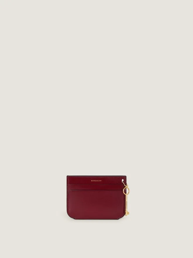 ボックスカーフスキンレザー製カードホルダー。「ラッキーチャーム」ライン。前面にゴールドのGivenchyシグネチャー。Givenchyの刻印入りキーチャーム付き
