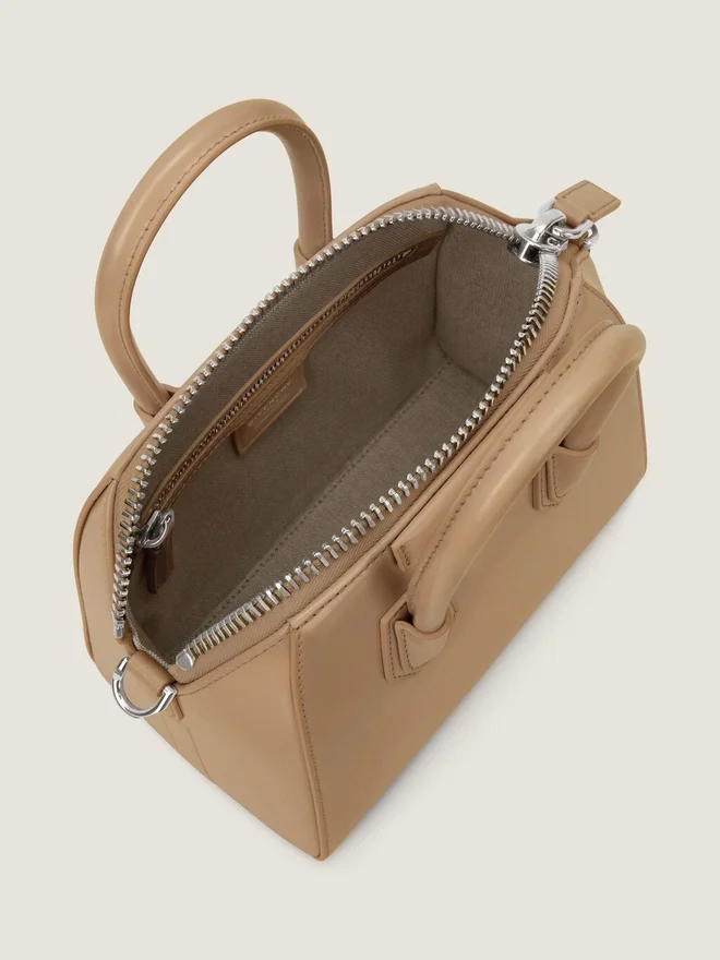 ミニ バッグ・イン・ボックス カーフスキンレザー。Antigona ライン。ファスナー開閉。手持ちまたはクロスボディ。レザーハンドル。長さ調節可能で