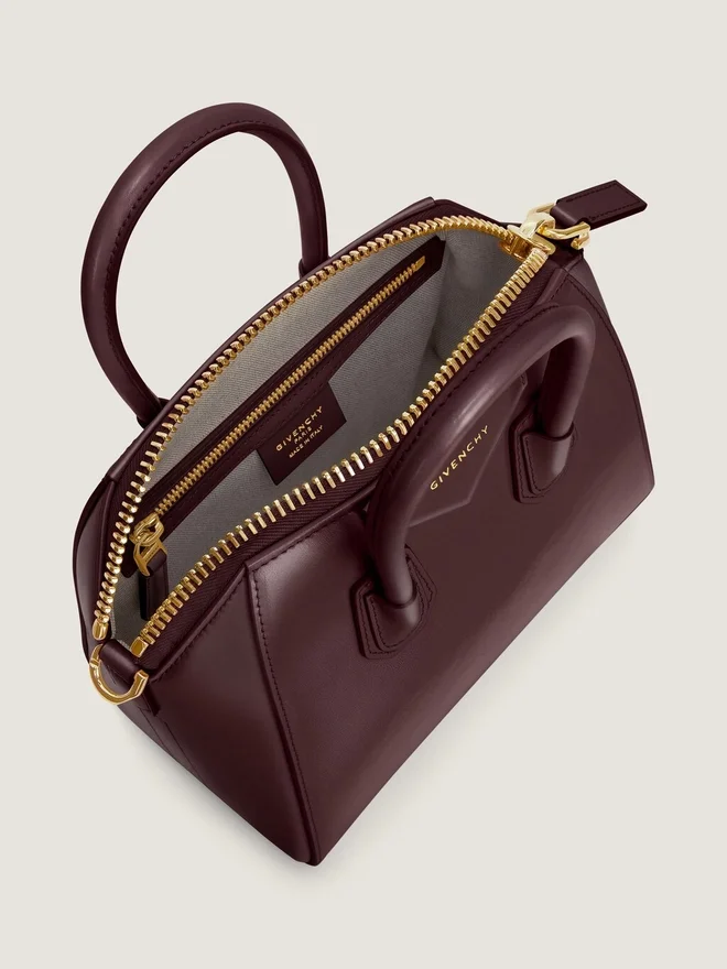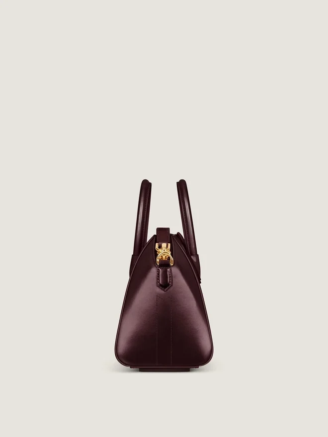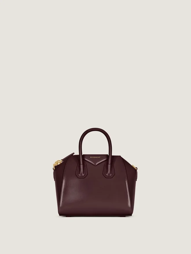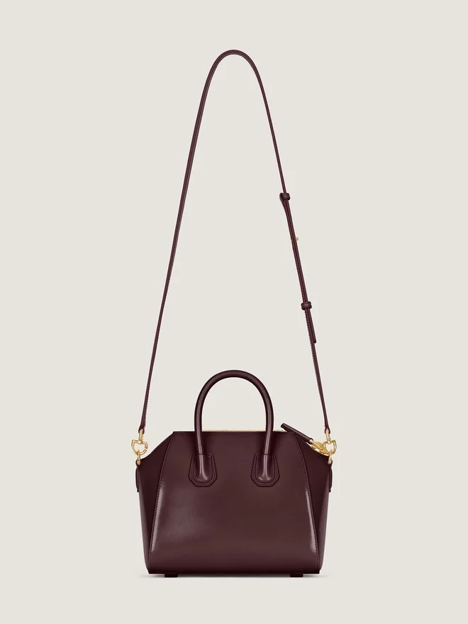 ボックスカーフスキンレザー製のミニハンドバッグまたはクロスボディバッグ。Antigona ライン。ファスナー開閉式。レザーハンドル。長さ調節可能、取り外し可能