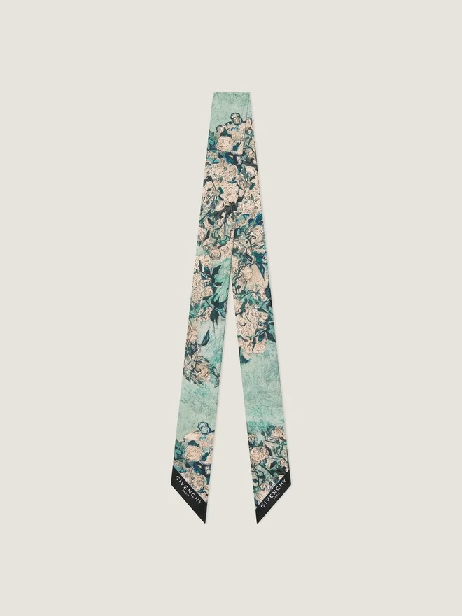 シルクツイル製のバンドゥ。筆のタッチからインスピレーションを得たローズプリント。縁は面取り加工が施され、コントラストを効かせたGIVENCHY PARISのシグネチャーが施されています。