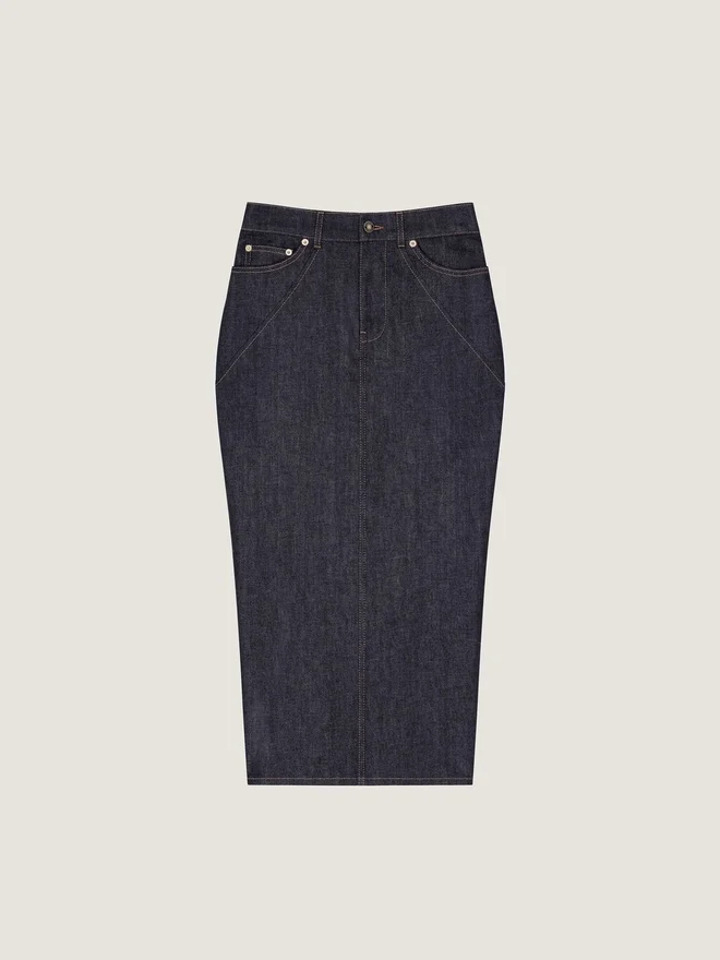 コントラストステッチが施された生デニムのミディスカート。キックバックディテール。ウエストにはループ、ファスナーとボタン留め付き。フロントに3つの