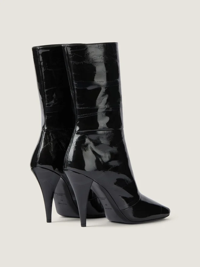 光沢のあるカーフスキンレザー製のアンクルブーツ。スライスド・スクエア・ライン。スクエアトゥ。曲線的なコーンヒール。ジップ開閉式、GIVENCHYのエンボス加工入り
