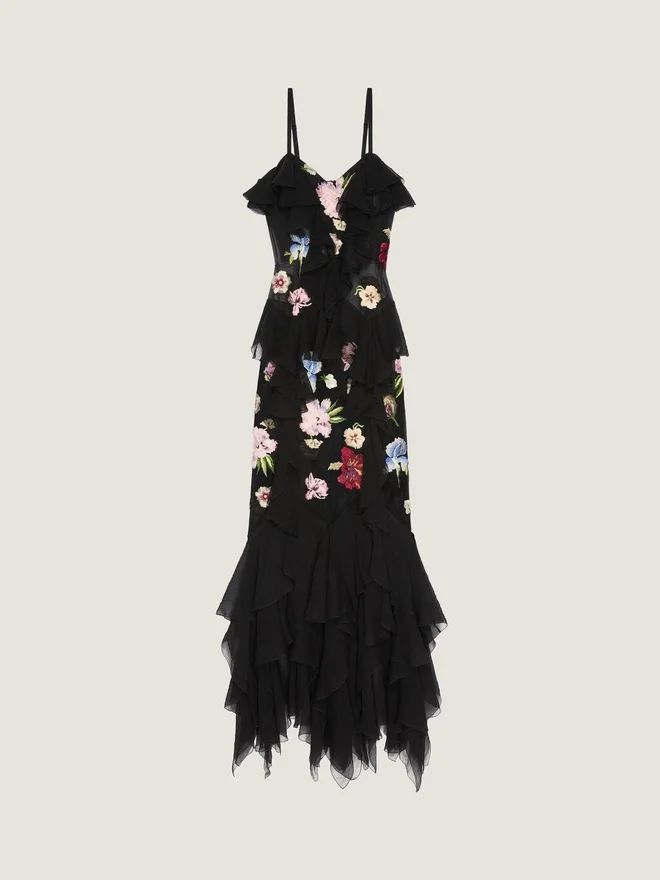 シルエットは咲き誇る花々から着想を得ており、ポプリンのシャツは花びらのように肩から滑り落ち、ドレスはフリルをあしらった裾から優雅に広がります。プリント、シルク、ビスコースにはジャカードやシルクスクリーンによる花柄が施され、サテンステッチの刺繍はユベール・ド・Givenchyのアーカイブを彷彿とさせます。シルクシフォン製のロングフリルドレス。フローラル刺繍。Vネック。調節可能なストラップ。 フリル:100%シルク。裏地:100%シルク。お手入れ方法・洗濯不可・アイロン不可・タンブル乾燥不可・漂白不可・炭化水素系ドライクリーニング