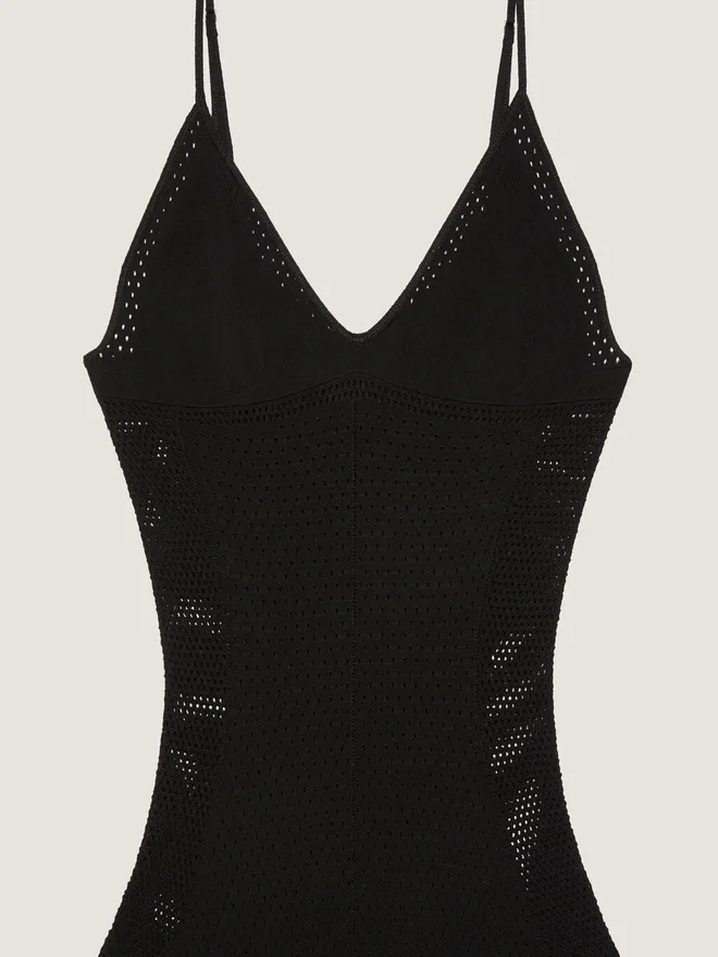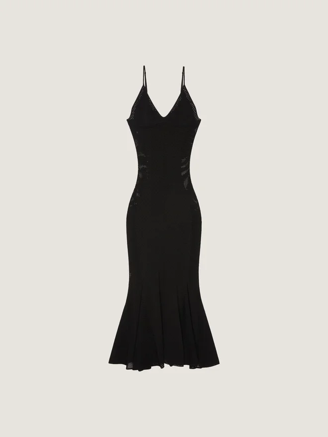 透かし編みのミディドレス。Vネック。細めの調節可能なストラップ。Slim Fit。モデルの身長は5フィート8インチ、着用サイズはSです。
