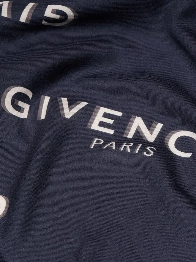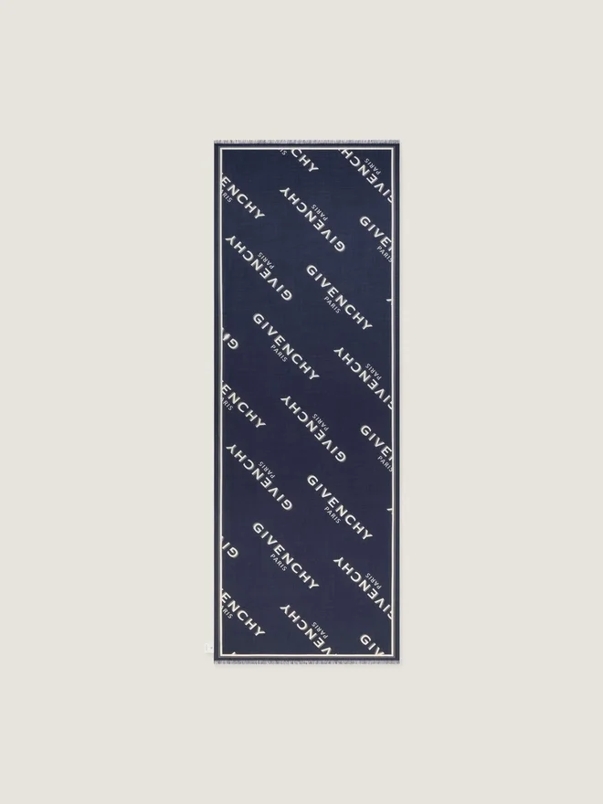 ウールとシルクのストール。Givenchy Parisの「シャドウ」Signature Printが全面にプリントされています。フリンジ付き。