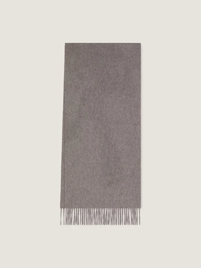 カシミヤ製スカーフ。縁に「Givenchy Paris」のシグネチャー刺繍入り。フリンジ付き。